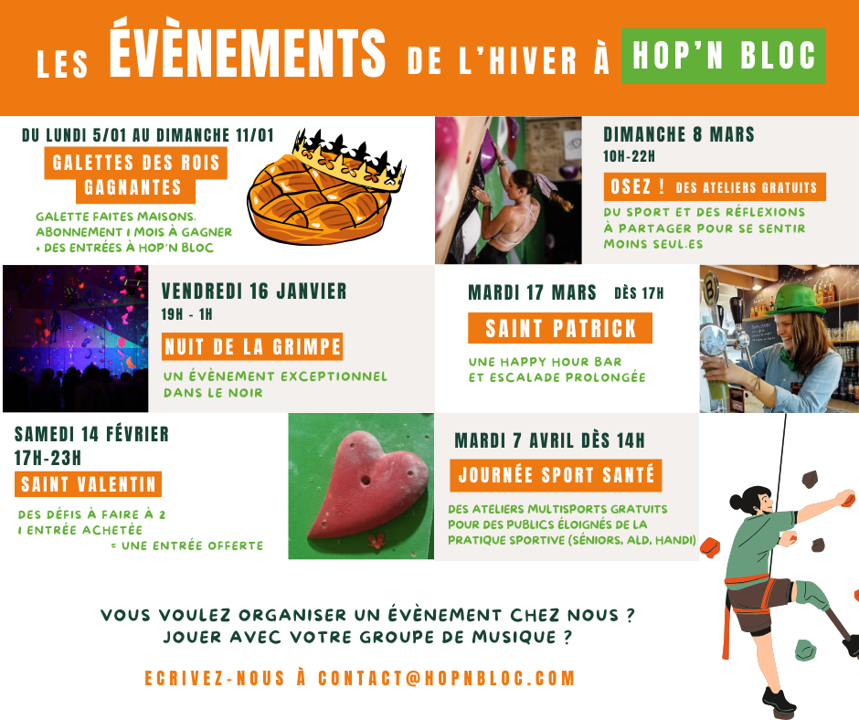 Pour bien débuter l’escalade de bloc en salle, peu d’équipement est nécessaire : une paire de chaussons d’escalade (location sur place possible), des vêtements confortables et c'est parti! Les blocs sont renouvelés régulièrement et classés par niveaux, ce qui permet de progresser rapidement tout en s’amusant. L’encadrement et l’ambiance de Hop’n Bloc offrent un cadre idéal pour apprendre les bases, améliorer sa technique et développer force, équilibre et coordination.