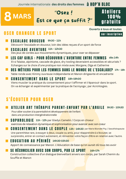 Une journée ouverte à tous, hommes et femmes, pour aborder des sujets variés autour du droit des femmes. Deuxième édition sur le thème "Suffit-il d'oser ?" Des ateliers 100% gratuits pour se rencontrer, échanger et repartir avec des réflexions et outils ! Et parfois même, comprendre et se sentir moins seul.e.s La salle d'escalade restera […]