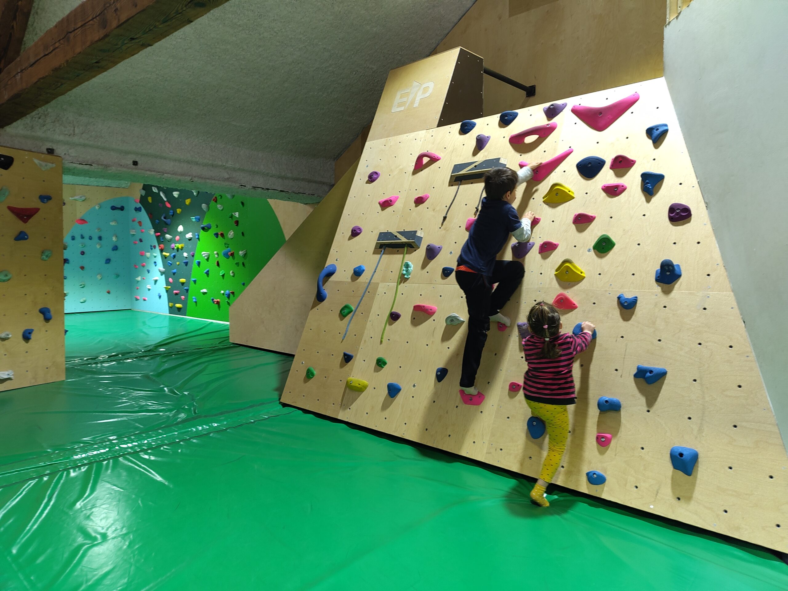Chez Hop’n Bloc, les murs sont adaptés aux jeunes grimpeurs. Les blocs sont à faible hauteur et les zones de réception sont équipées de matelas épais pour assurer la sécurité.